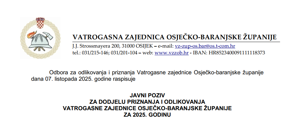 Poštovani, dostavljamo Javni poziv za dodjelu priznanja i odlikovanja Vatrogasne zajednice Osječko-baranjske županije za 2025. godinu, zajedno s pripadajućim obrascem. […]