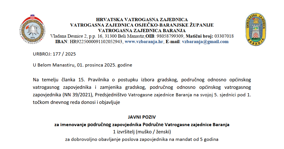 Poštovani, niže prenosimo tekst Javnog poziva za imenovanje područnog zapovjednika PVZ Baranja. […]