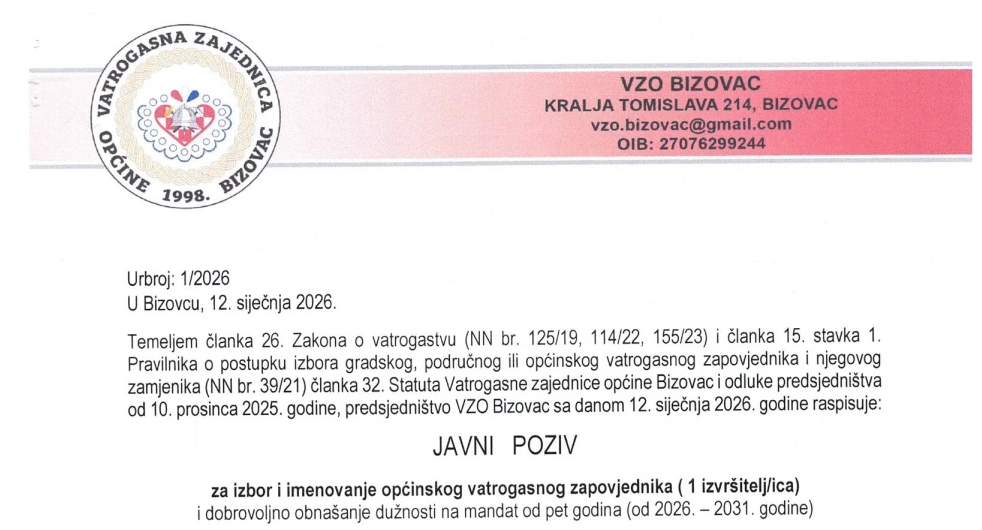 Poštovani, niže prenosimo tekst Javnog poziva za imenovanje općinskog vatrogasnog zapovjednika VZO Bizovac. […]