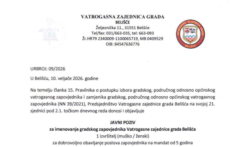 Poštovani, niže prenosimo tekst Javnog poziva za imenovanje gradskog zapovjednika VZG Belišće. […]