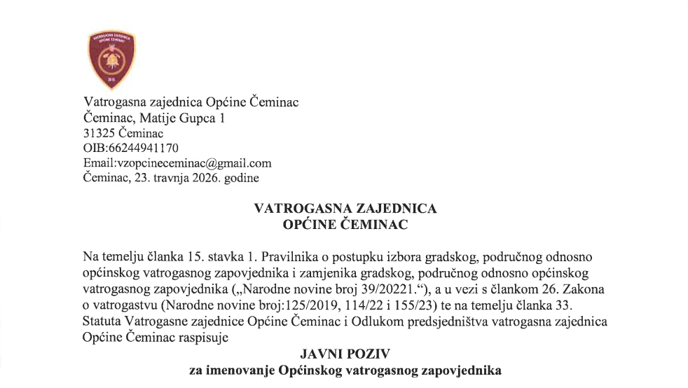 Poštovani, niže prenosimo tekst Javnog poziva za izbor i imenovanje zapovjednika VZO Đurđenovac. […]