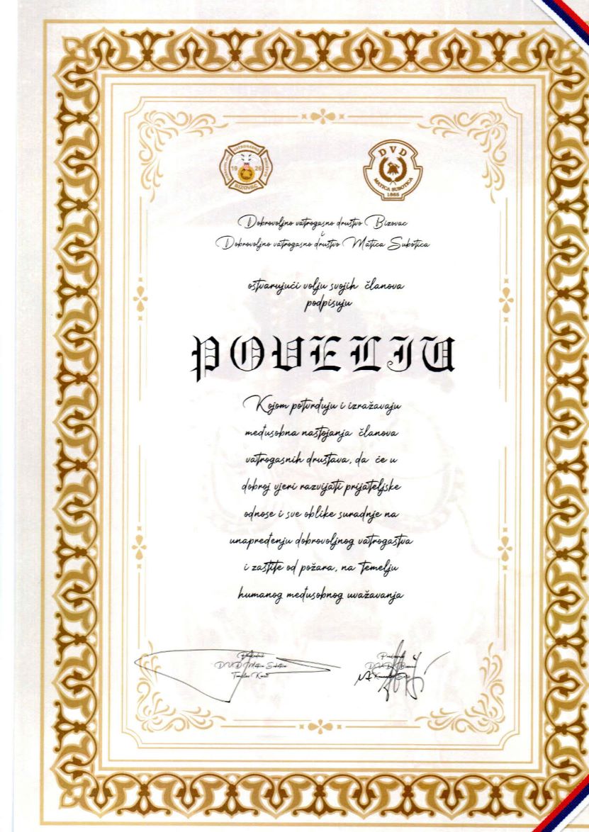 Tom je prigodom potpisana i Povelja prijateljstva između ova dva vatrogasna društva. Povelju je u ime domaćina potpisao predsjednik gospodin Tomislav Kovač, a u ime našeg društva gospodin Stjepan Sršić, koji je i bio začetnik ove suradnje prije 20-ak godina.