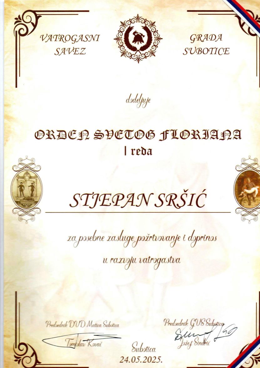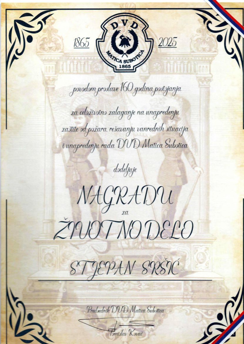 Upravo zbog toga, DVD Matica je gospodinu S. Sršiću dodijelila Plaketu za životno djelo, a od strane Vatrogasnog Saveza grada Subotice nagrađen je Ordenom sv. Florijana – I reda.