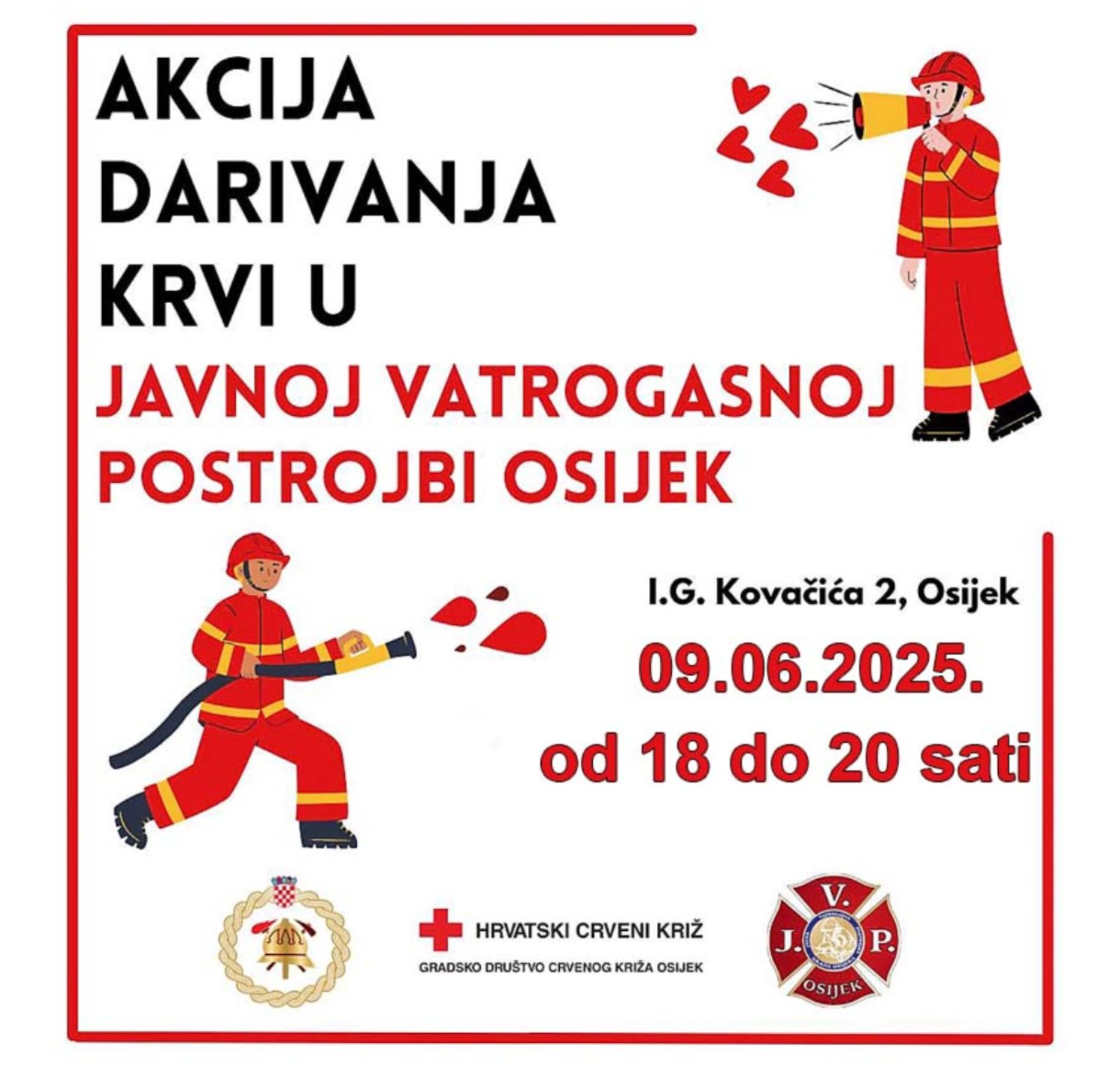 Pozivamo sve zdrave ljude dobre volje da se odazovu akciji dobrovoljnog darivanja krvi koja će se održati idućeg ponedjeljka, 9. lipnja, u prostorijama JVP Osijek od 18:00 do 20:00 sati.