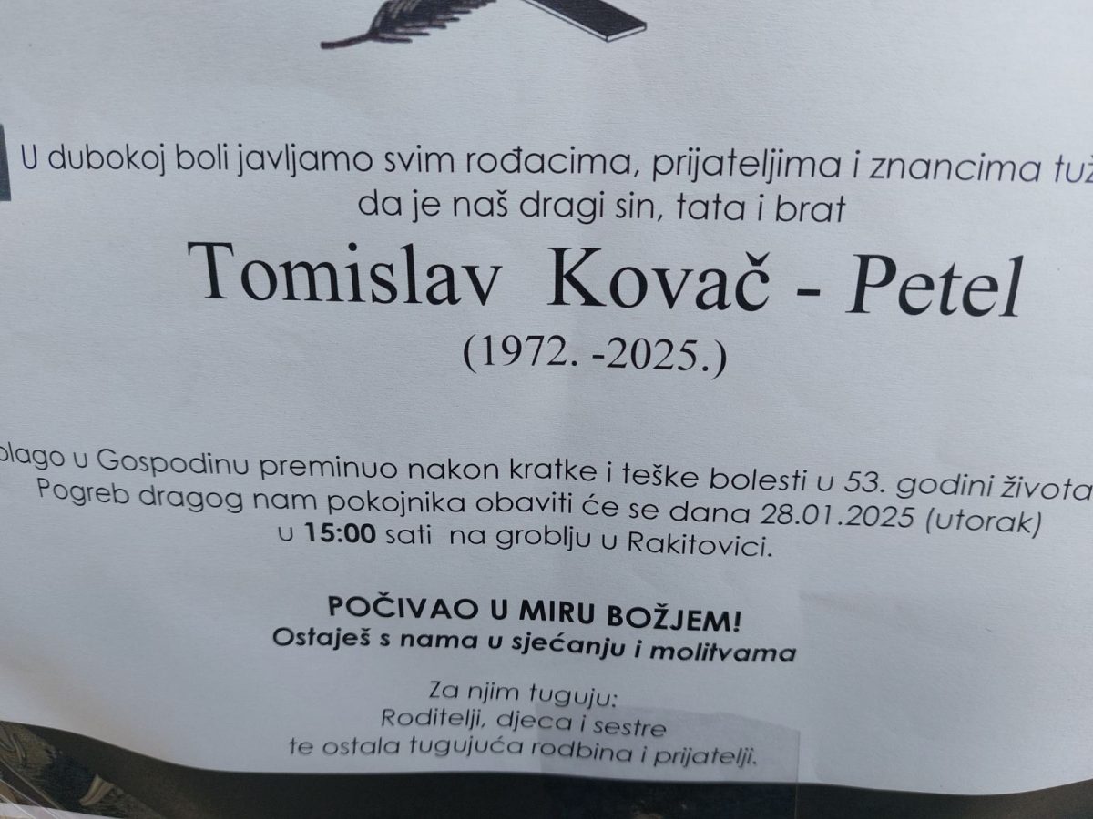 Ispraćaj pokojnika biti će na mjesnom groblju u Rakitovici u utorak 28.01.2025. godine u 15:00 sati.