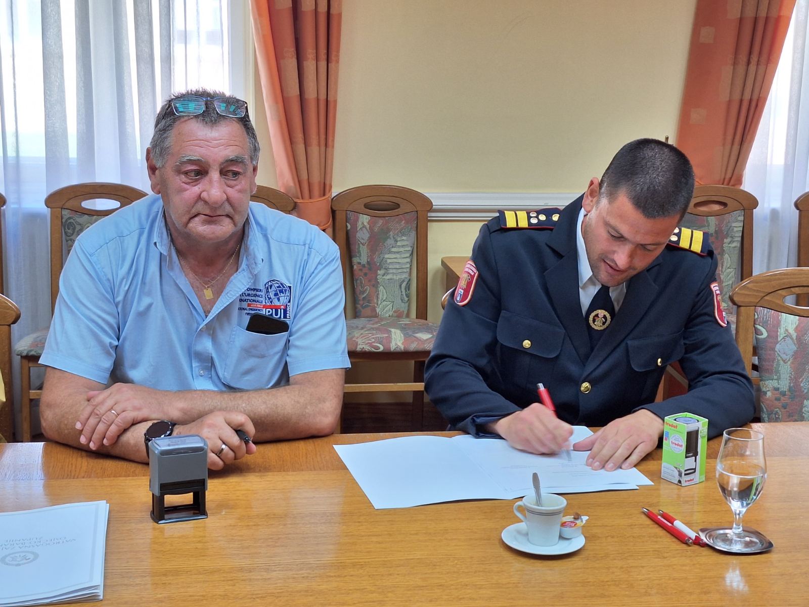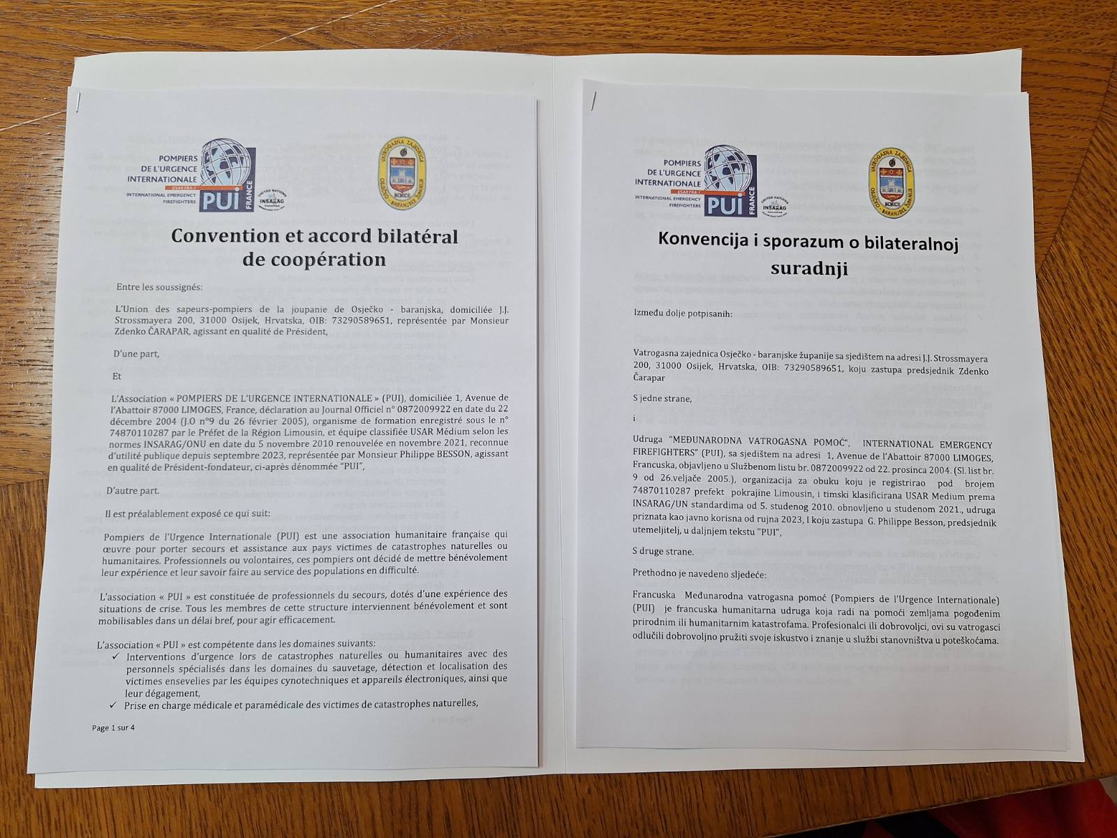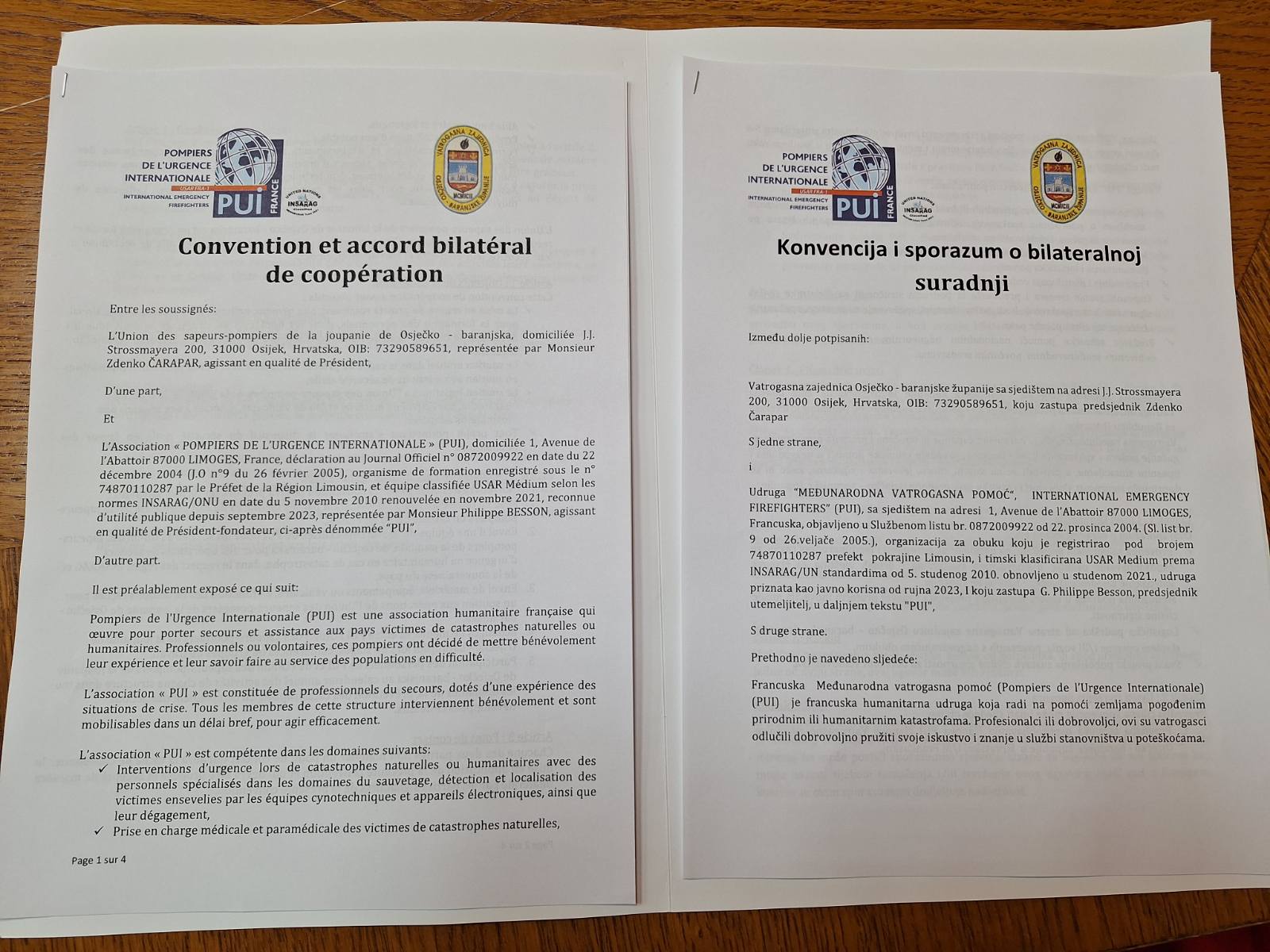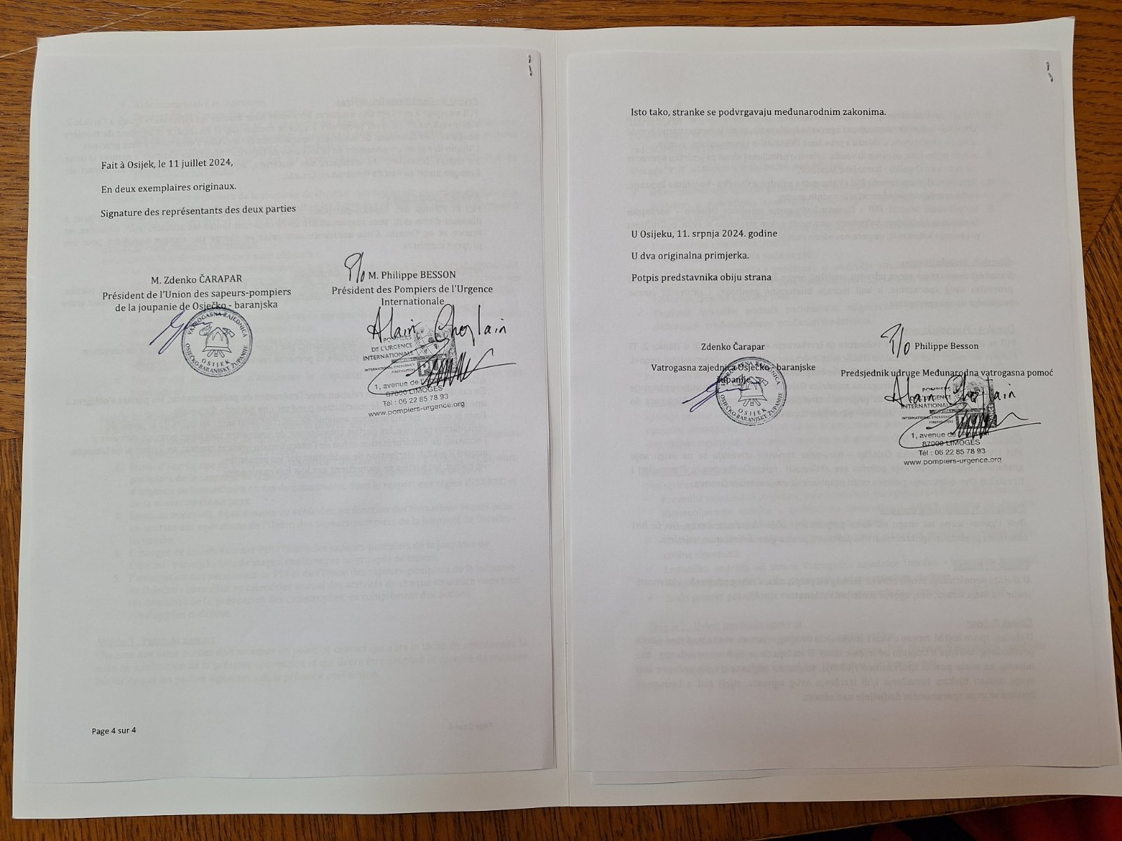 U ime Vatrogasne zajednice Osječko – baranjske županije Konvenciju je potpisao predsjednik zajednice g. Zdenko Čarapar, a u ime francuske udruge Međunarodna vatrogasna pomoć njezin predsjednik utemeljitelj g. Philippe Besson.